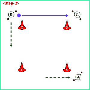 ボールを受けたBは必ずワントラップしてからCへパス。その後コーン1へ移動。